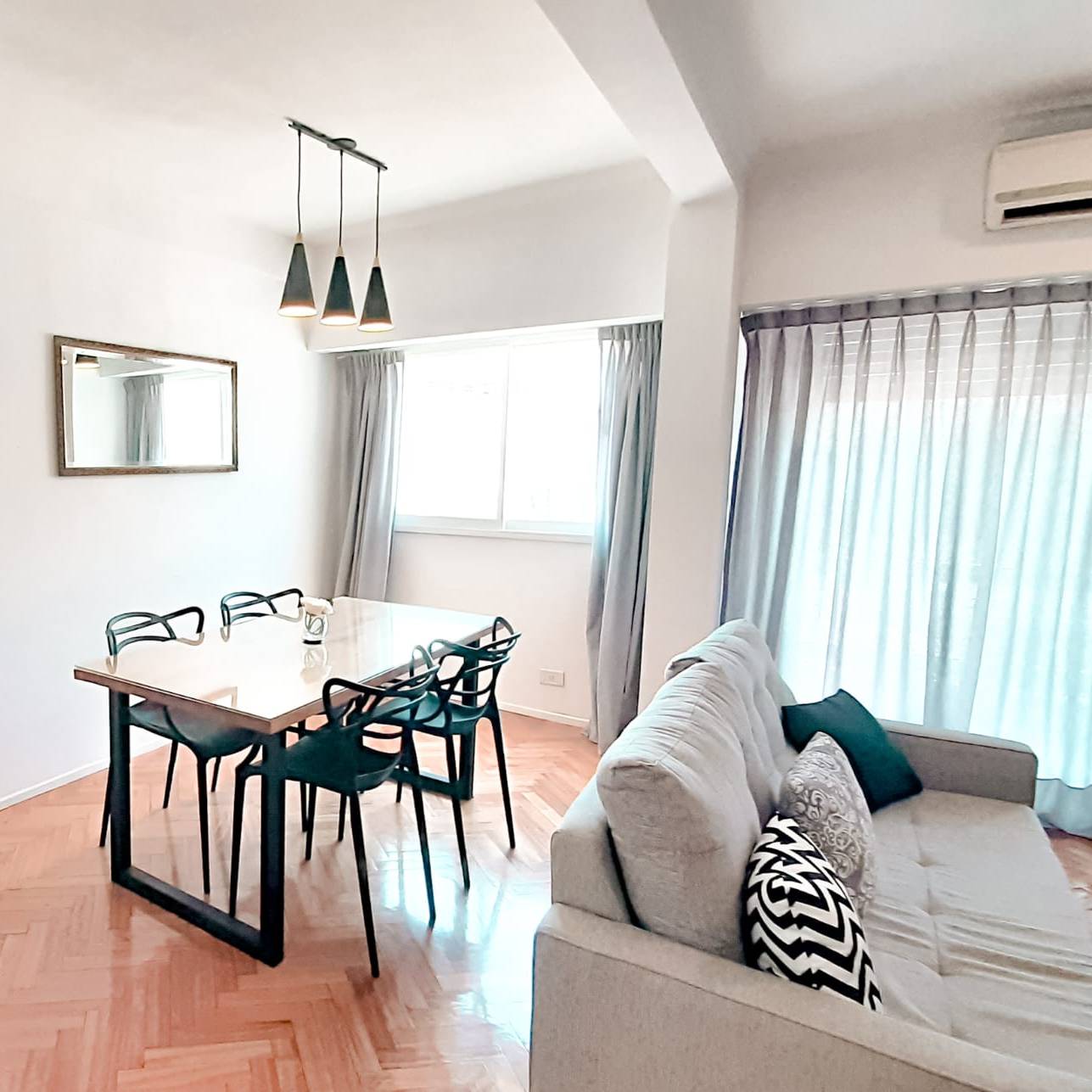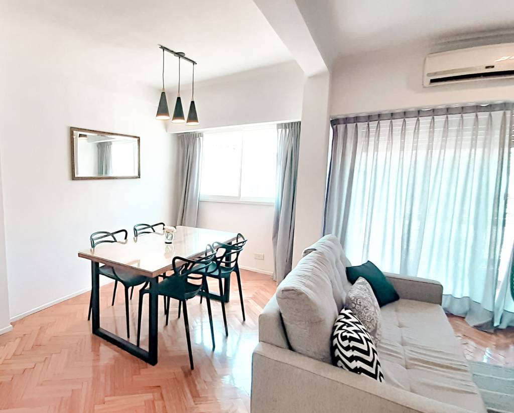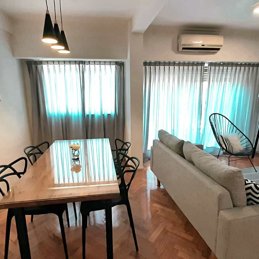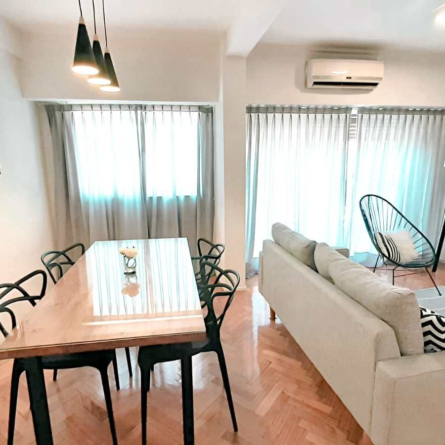 -Living-Comedor: con pisos de parquet y salida al balcón corrido. Cuenta con un amplio sillón, una mesa para 6 comensales, TV, aire acondicionado e internet wi-fi.