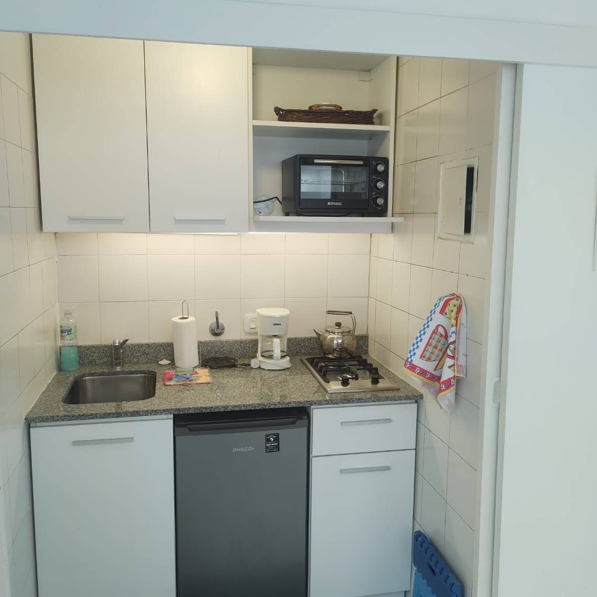 -Cocina: integrada y muy completa, con heladera bajomesada, anafe eléctrico y horno, cuenta con vajilla, cafetera, etc.