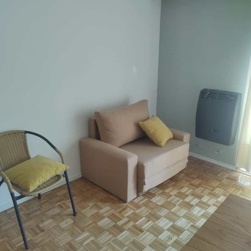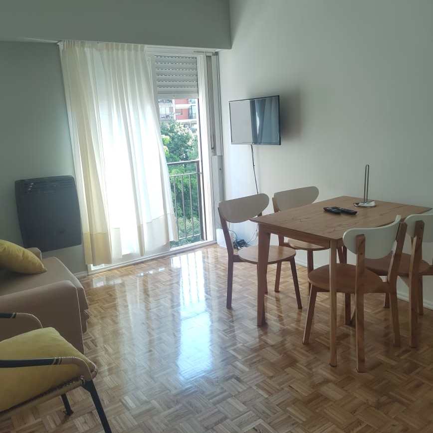 -Living-Comedor: con pisos de parquet, recientemente plastificados, mesa para cuatro comensales, sillón-cama, balcón francés, TV , calefactor a gas y amplio placad.