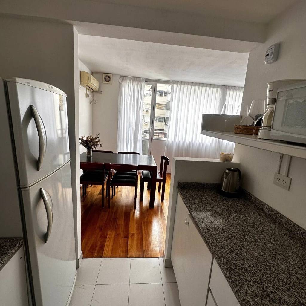 En la planta baja, living comedor, cocina semi integrada totalmente equipada con cafetera, microondas, pava eléctrica, tostadora y todo lo necesario para una cómoda estadía, toilette de recepción y balcón.