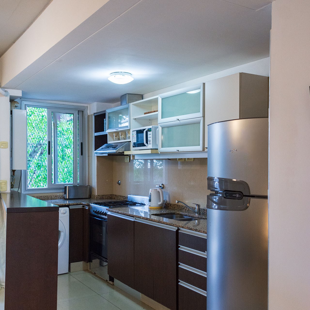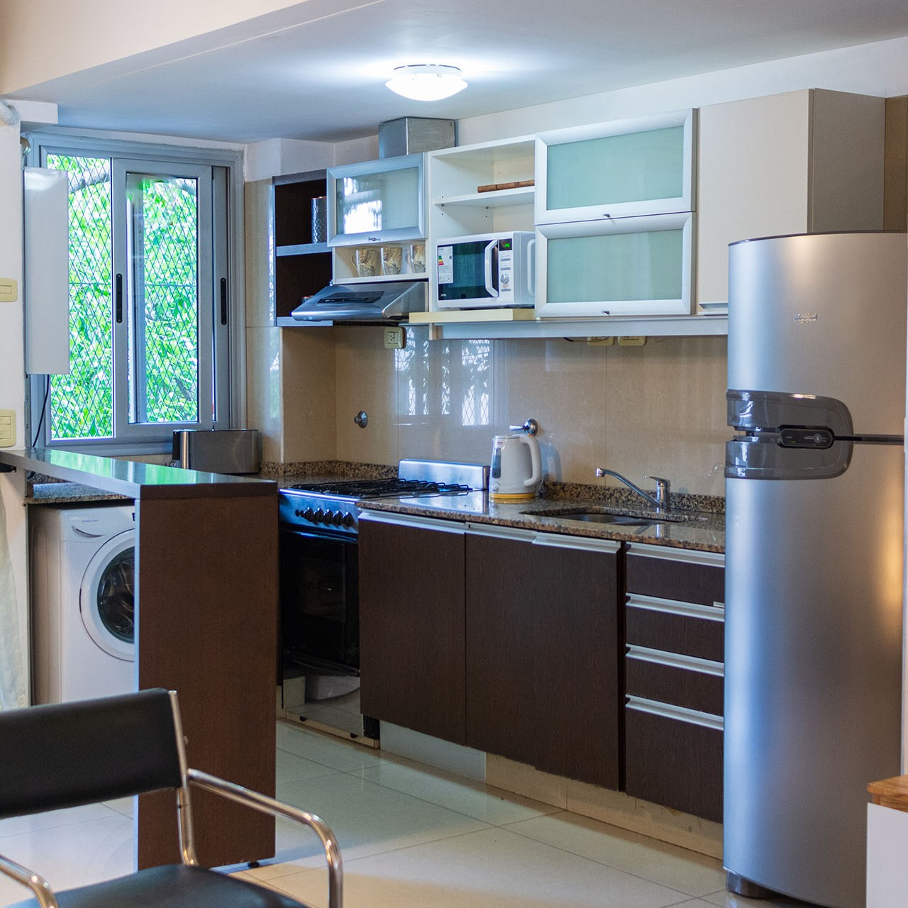 -Cocina: integrada y muy completa, con cocina 4 hornallas a gas con horno, heladera grande con frezzer, microondas, tostadora, cafetera, pava eléctrica y toda la vajilla necesaria. Cuenta con lavarropas automático.