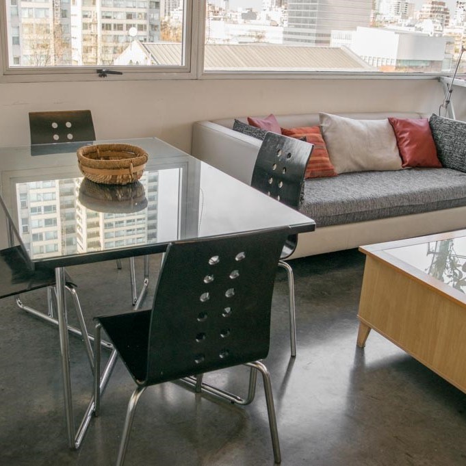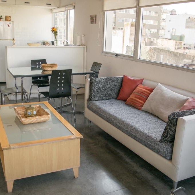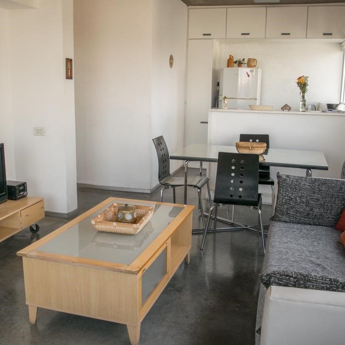 -Living-Comedor: amplio y luminoso con sillón, mesa para cuatro comensales, TV Smart, Internet y aire acondicionado.
