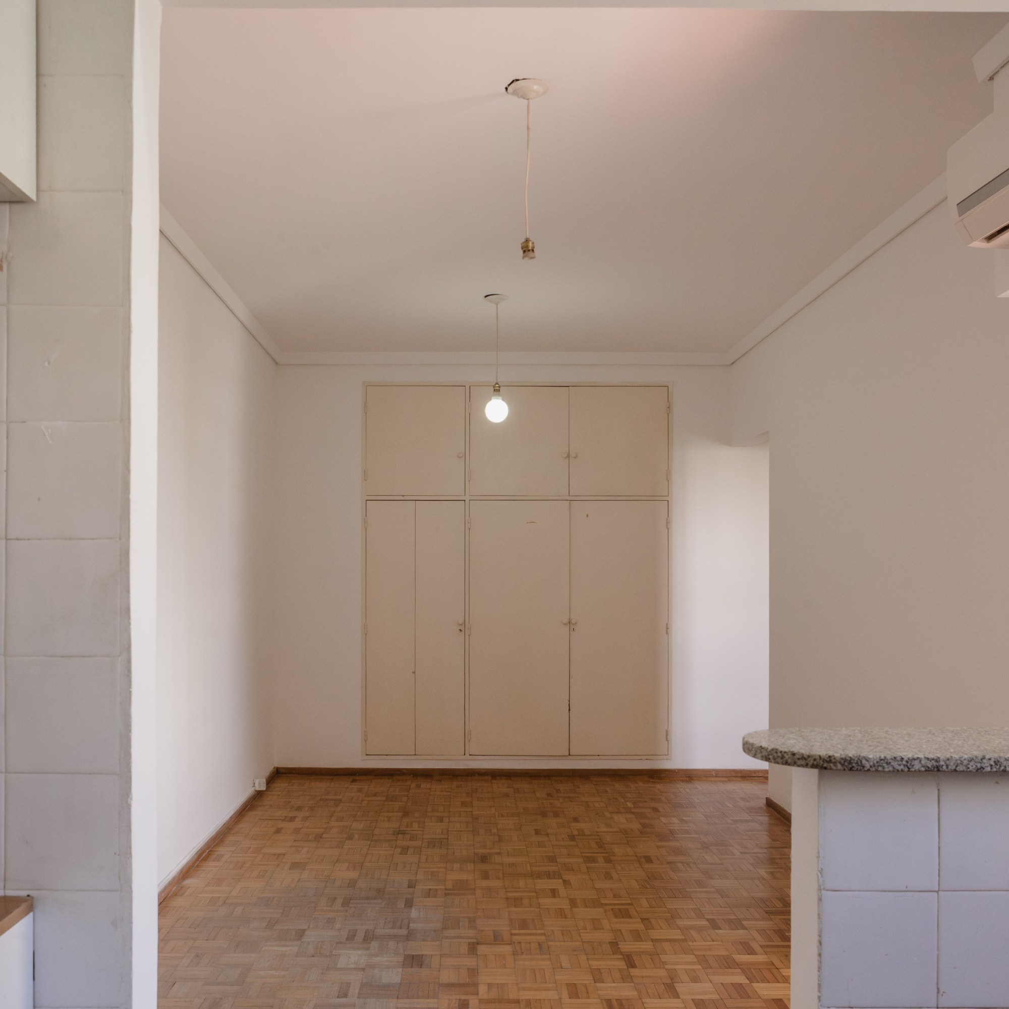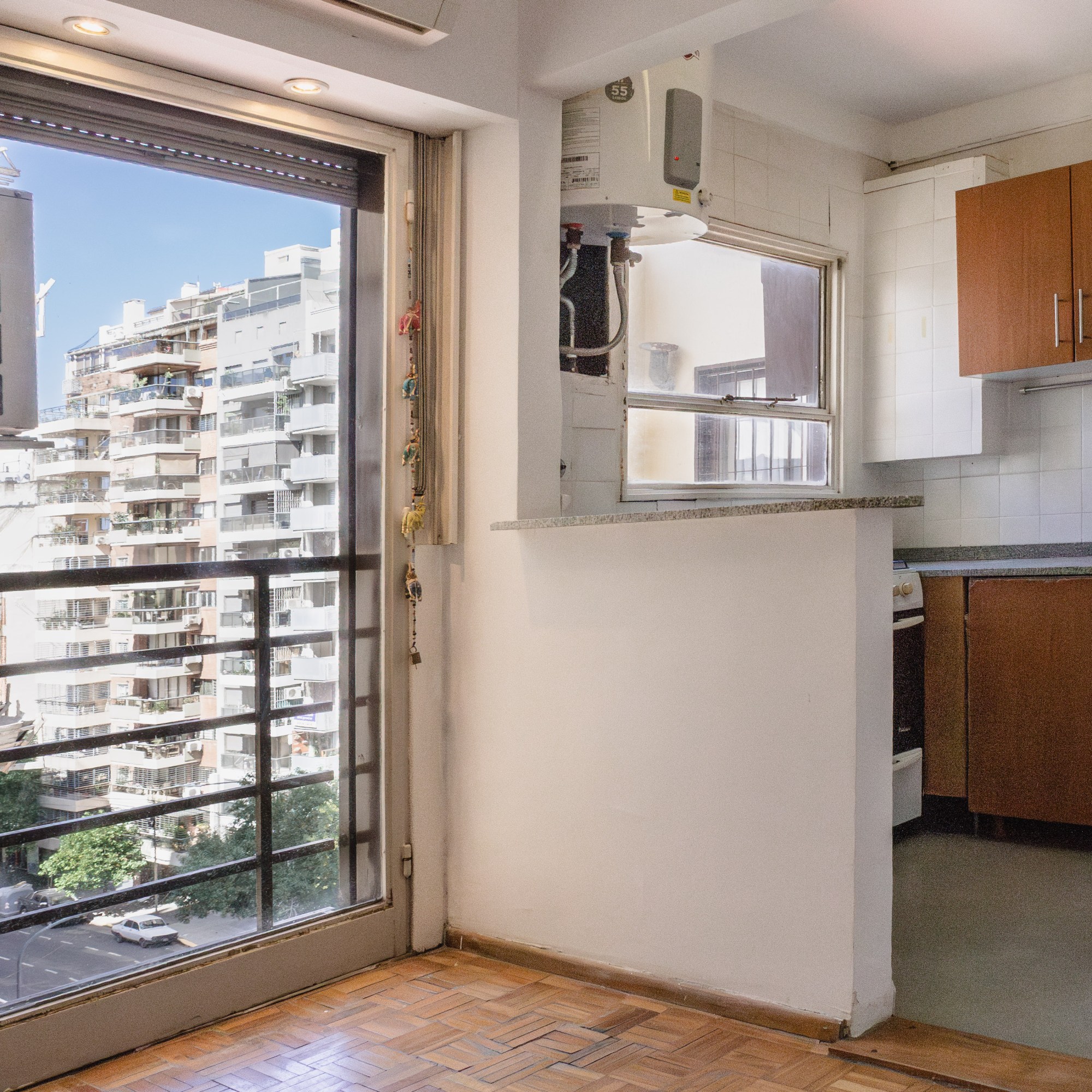 Cuenta con pisos de parquet, living-comedor con amplio ventanal y aire acondicionado, cocina integrada con cocina cuatro hornallas a gas.