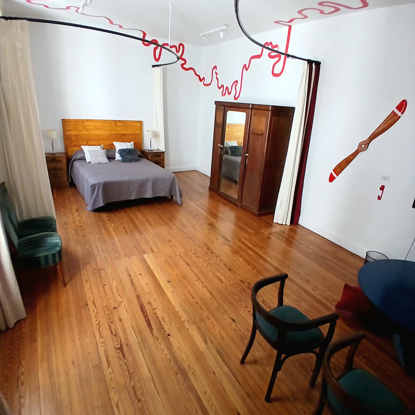 -El dormitorio principal es realmente amplio (30 m²), con una cómoda cama matrimonial y una sala de estar integrada con sillones, mesa y Smart TV.