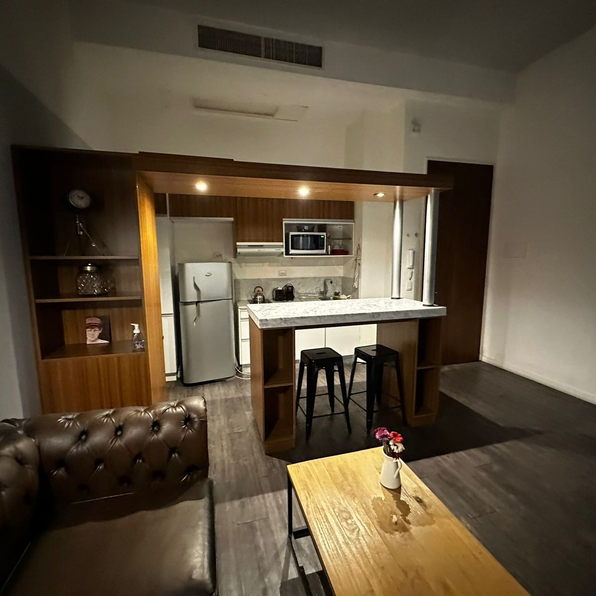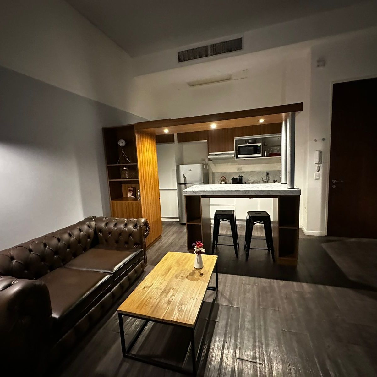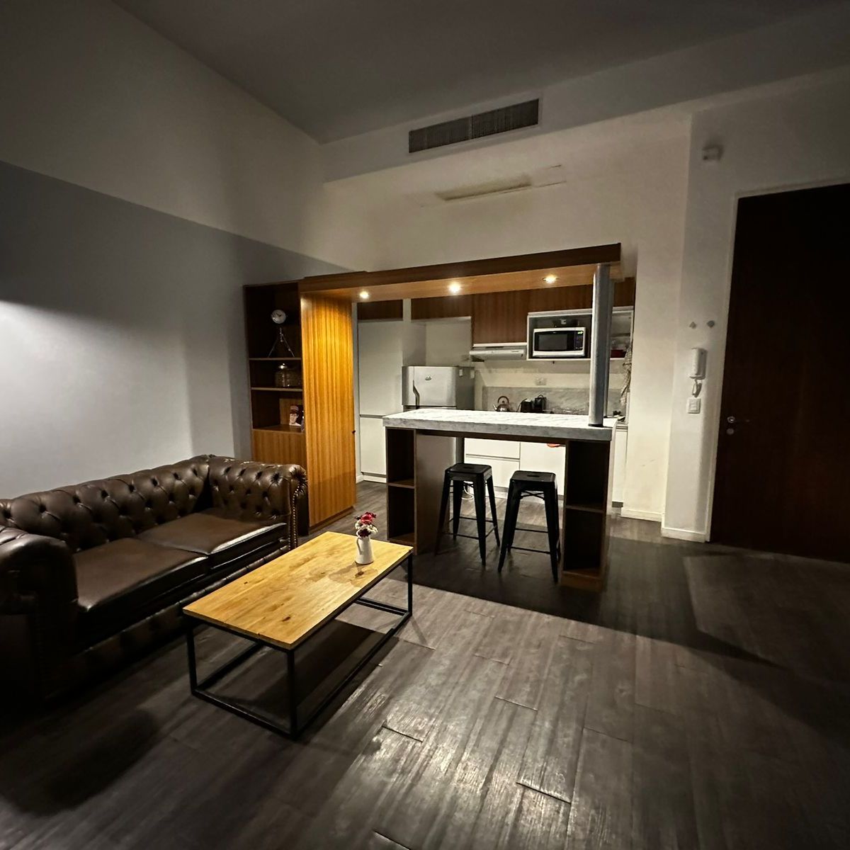 -Living comedor con sofá de cuero, mesa con dos sillas, LCD 32”, internet wi-fi, aire acondicionado y calefacción central.