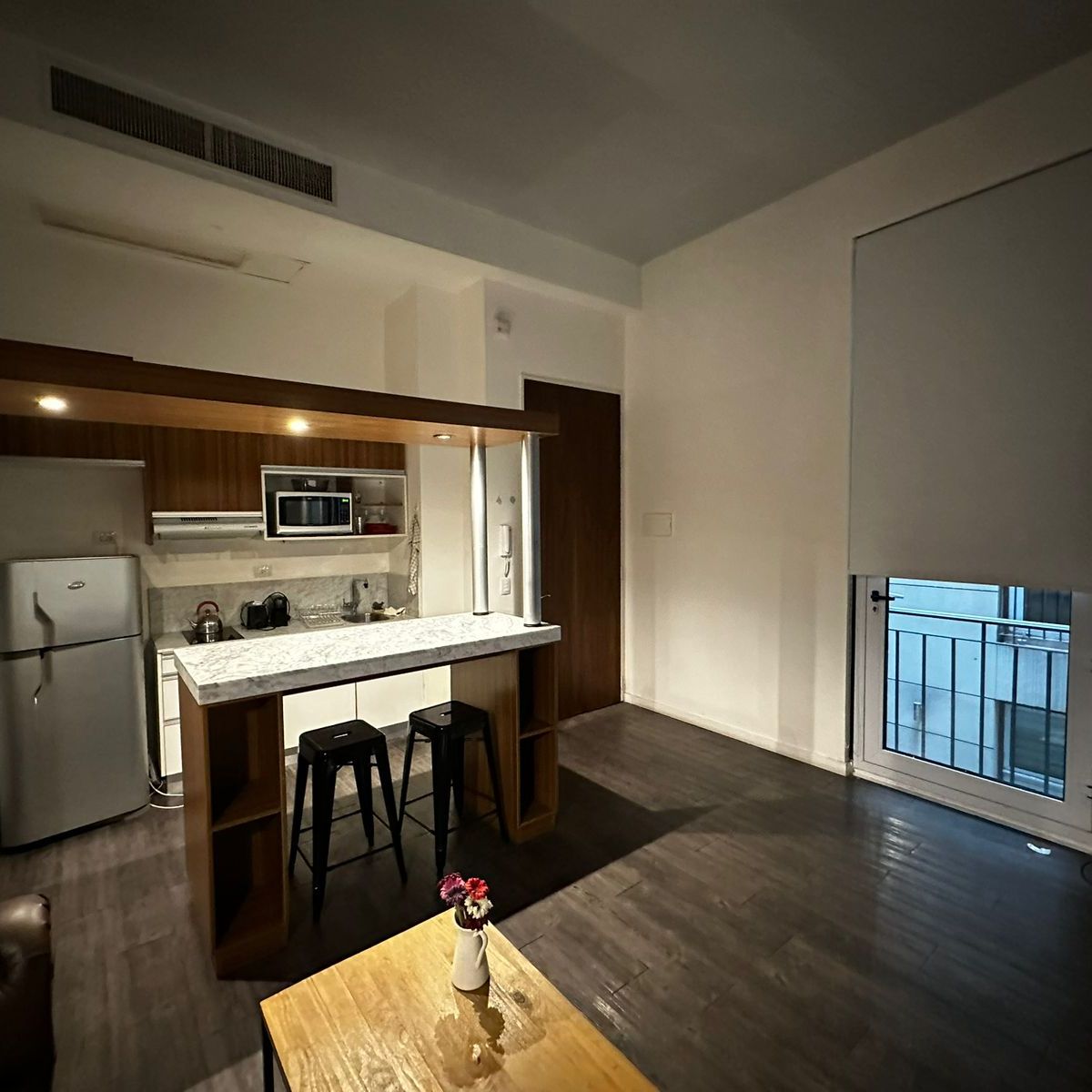 -Cocina integrada, totalmente equipada con heladera grande con frezzer, microondas, vajilla, barra para desayunar con dos banquetas altas.