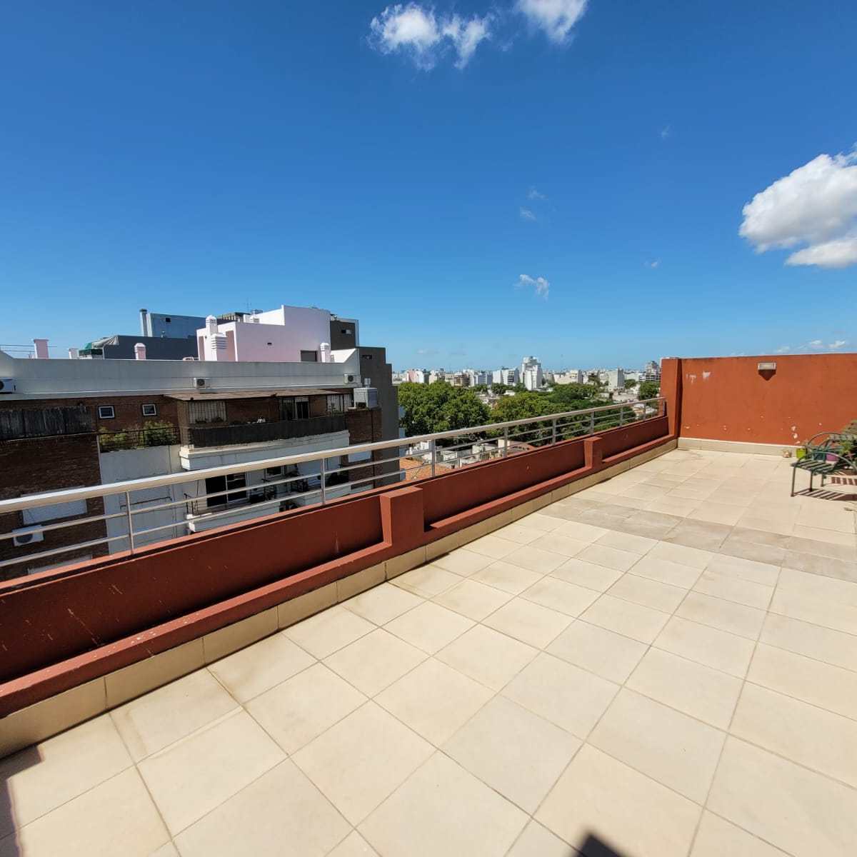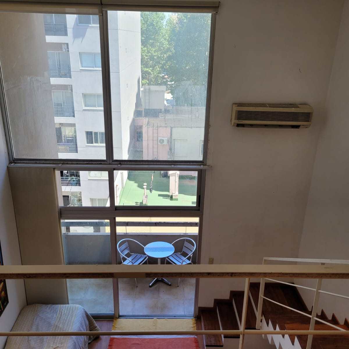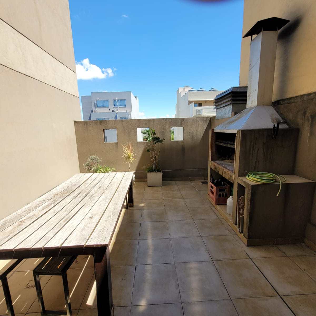 Balcón con parrilla: Un rincón ideal con mesa y 2 sillas para disfrutar de asados y una vista abierta al contrafrente del edificio.