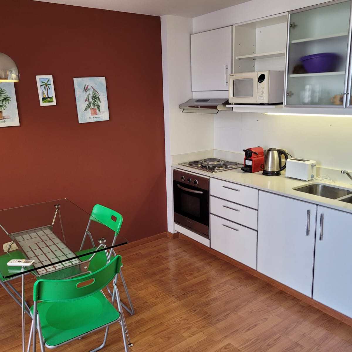 Cocina integrada: Equipada con muebles altos y bajos, heladera con freezer, microondas, cafetera Nespresso, tostadora eléctrica y anafe eléctrico.