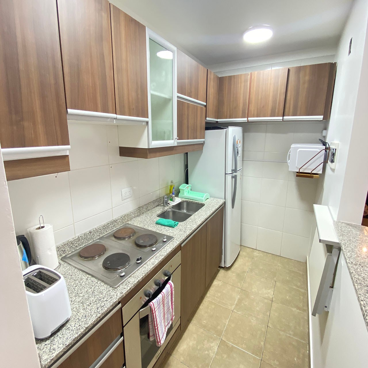 -Cocina completa con barra -desayunadora, heladera con freezer y -microondas